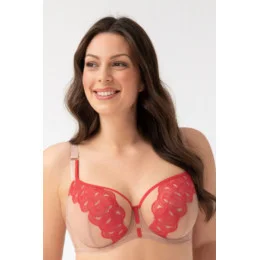 Velká měkká podprsenka pro ženy se středním až velkým poprsím, zvednutý most, ramínka posunutá do strany – poprsí pevně stažené dovnitř, účinek velmi silného zvednutí poprsí