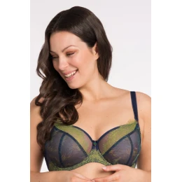 Biustonosz miękki przeznaczony dla kobiet ze średnim i dużym biustem. Zapewnia efekt uniesienia i zebrania biustu do środka, 3-częściowe miski wykonane ze stabilnej koronki z rzęskami i tiulu stabilnego. Górna krawędź miski przechodzi płynnie do ramiączka powodując lepsze podtrzymanie biustu. Tył z transparentnej lycry zapewniającej bardzo dobre dopasowanie i podtrzymanie. Fiszbiny boczne zapobiegające zwijaniu się materiału .W zależności od rozmiaru dwu lub trzyrzędowa haftka z trójstopniową regulacją obwodu. Nieodpinane, regulowane ramiączka w trzech szerokościach .Metalowe elementy w kolorze jasnego złota.