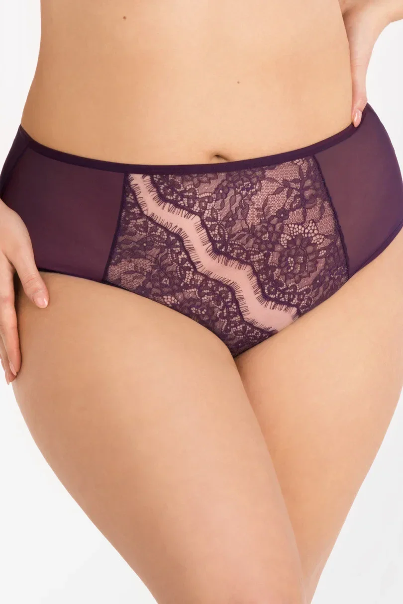 Přední strana: stabilní krajka podšitá stabilním tylem, na bocích jednovrstvý elastický tyl.