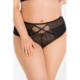 Přední díl: stabilní krajka podšitá stabilním tylem, ozdobné proužky z pružné pásky s regulátory, boky ve vrchní části z jednovrstvého pružného tylu, ve spodní části pružný tyl složený na hladko, část nohaviček olemovaná úzkou pružnou páskou.