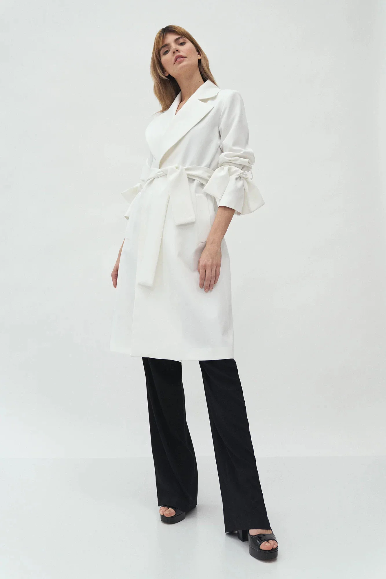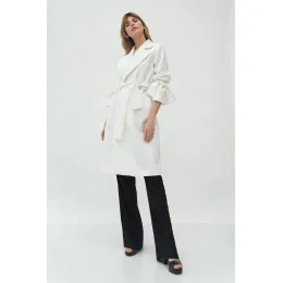 Kabát s délkou ke kolenům, páskem na zavázání v pase, širokými klopami a předními kapsami. Pásky na zavazování v manžetách umožňují upravit délku rukávů.