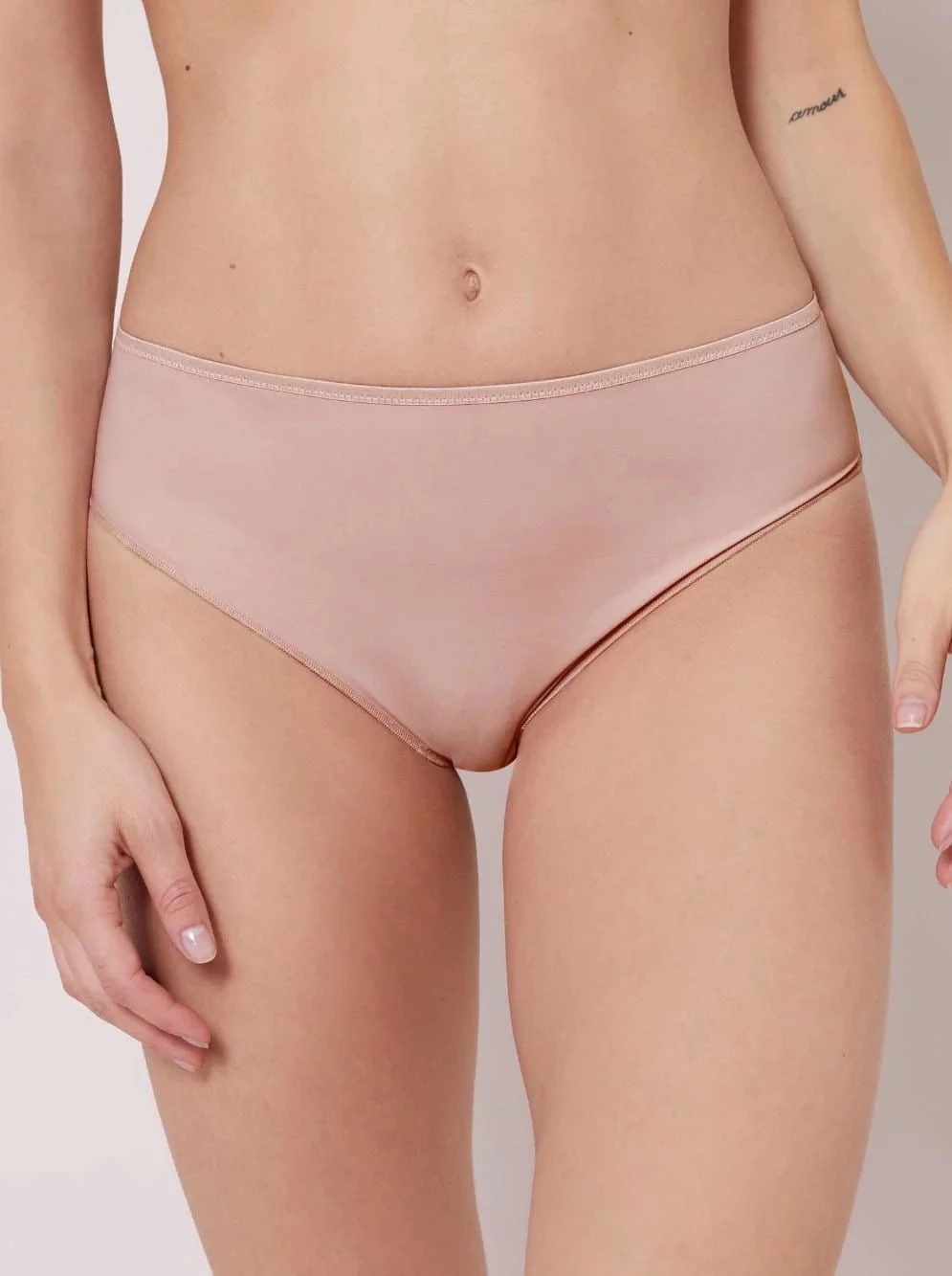 Kalhotky s vysokým pasem z úpletu. Neprůhledná pletená přední část. Zadní díl z neprůhledného úpletu a měkký elastický lem kolem stehen.
