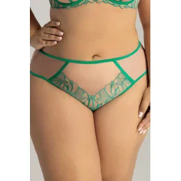 Podkreśl swoją kobiecość z wyjątkowymi figami w kolorze cielistym, które ożywione są subtelnym, a zarazem wyrazistym haftem w soczystym odcieniu zieleni. Przód wykonany z delikatnego tiulu tworzy lekki i zmysłowy efekt na skórze, a zielone lamówki oraz roślinny motyw haftu nadają całości nowoczesnego i świeżego wyglądu.