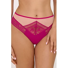 Spodní díl bikin AV 2220 Fuchsia je jedinečnou kombinací elegance, pohodlí a ženské energie. Intenzivní odstín fuchsiové barvy upoutá pozornost, zatímco krajkové zdobení v kombinaci s průhledným tylem dodává lehkost a jemný sex-appeal. Geometrické vsadky opticky zeštíhlují postavu a zdůrazňují boky a pas.