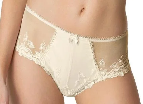 Dámské kalhotky s výšivkou a krajkou na bocích. Barva - vanilka. Materiál - 64% polyurethane, 16% polyamid, 12% elastan, 6% bavlna, 2% polyester