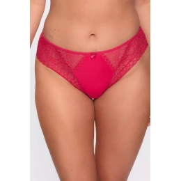 Klasický spodní díl bikin v elegantní malinové barvě je kvintesencí ženského stylu a pohodlí. Přední a zadní díl zdobí jemný ažurový vzor květinové krajky, který dodává lehkost a smyslnost. Střední část předního dílu je vyrobena z hladké, měkké tkaniny pro celodenní pohodlí. Spodní díl bikin je zakončen jemnou mašličkou v pase a kombinuje klasickou eleganci s romantickým nádechem. Dokonale se přizpůsobí postavě a skvěle se hodí k podprsence ze stejné kolekce.