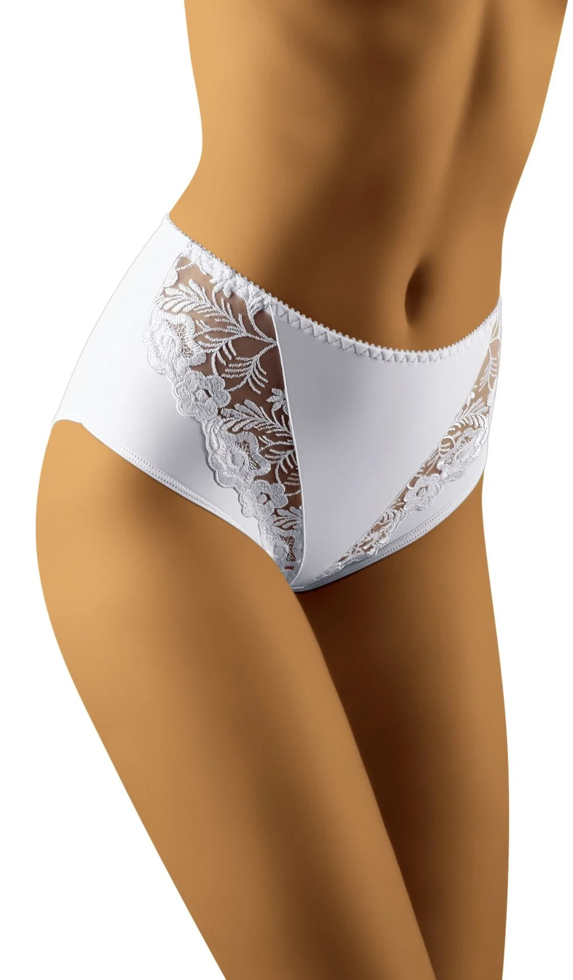 Gabe jsou mírně plnější kalhotky, které dokonale sedí na těle a pružně ho tvarují. Zcela hladká záda a přední díl jsou prošpikovány ozdobnou krajkou, koketně se rozbíhající po přední části kompozice. Inspirujícím a výrazným prvkem se zde stávají velké, jemné květy s krásně rozkvetlými poupaty, které vnášejí úžasný, velmi ženský vzhled. Pohodlí v kombinaci s elegantním šarmem.