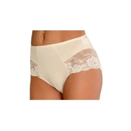 Dámské kalhotky z kvalitní bavlny a příměsí elastanu 6%. Vysoké, se širokou boční částí. Boční části dekorují krajkové všivky s květinovým vzorem.