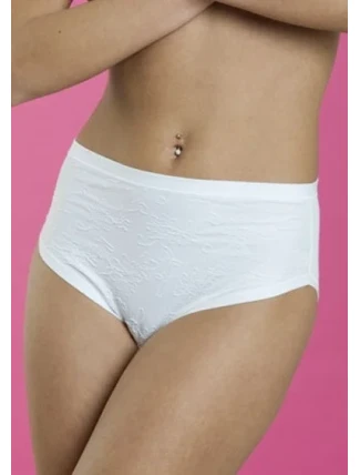 Dámské kalhotky vyššího střihu od značky Lovelygirl. Kalhotky jsou vyrobené z bavlny a ze 100% celulózového vlákna modal. Díky tomuto složení kalhotky zaručují barevnou a tvarovou stálost a jsou velice příjemné na nošení. Přední část je vyrážena plastickým květinovým vzorem. Materiálové složení: 45% bavlna, 45% modal, 10% elastan