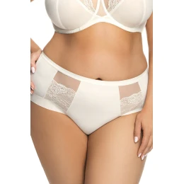 Eleganckie figi damskie w odcieniu ecru, zaprojektowane w wygodnym, bardziej zabudowanym fasonie. Pełny krój zapewnia dobre krycie i stabilne dopasowanie do sylwetki, dzięki czemu model świetnie sprawdza się w codziennym użytkowaniu. Przód i tył wykonane są z gładkiego, miękkiego materiału, który komfortowo układa się na ciele. Po bokach zastosowano lekkie wstawki z tiulu oraz ozdobnej koronki o delikatnym, kwiatowym motywie, nadające całości subtelnej lekkości i kobiecego charakteru. Starannie wykończone krawędzie zwiększają wygodę i pozostają dyskretne pod odzieżą.