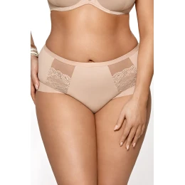 Elegantní kalhotky v béžové barvě. Je vyroben z měkkého mikrovlákna a na přední straně je zdoben dvěma krajkovými vsadkami. Na zadní straně hladké. Nohavičky vpředu i vzadu zakončené dvojitě skládaným, jemným elastickým tylem.