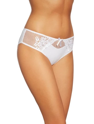 Fenomenální kalhotky, vzadu hladké a vpředu půvabně krajkové. Síťovaná krajka doplněná krásnou květinovou výšivkou viditelnou blíže ke středu prádla, s jemným průsvitným efektem. Malá mašlička nahoře.