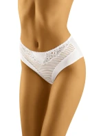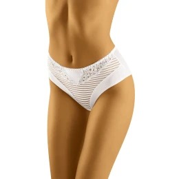Pohodlné kalhotky mírně vyššího střihu s elegantně zdobenou přední částí. Stehna s hladkým povrchem, zadní část rovněž hladká. Oblast pasu je zdobená jemnou a krásnou krajkou.