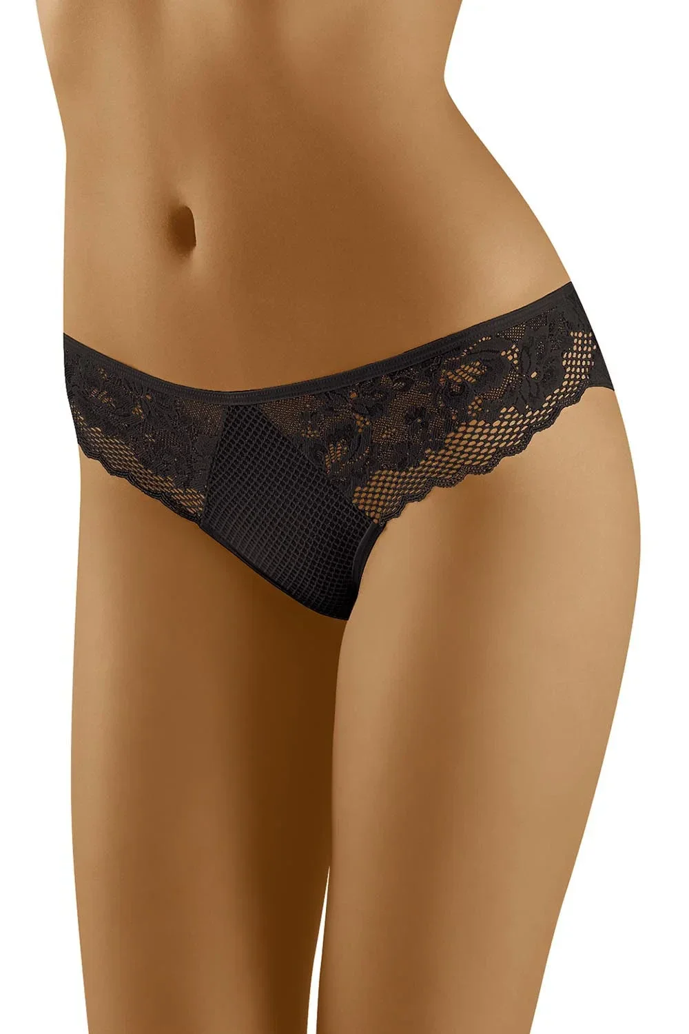 Jedinečná nabídka pro ženy, které hledají krásu a pohodlí. Okouzlující kalhotky v zajímavém uspořádání - vpředu žakárová vsadka, boky z krajky, vzadu zcela hladké.