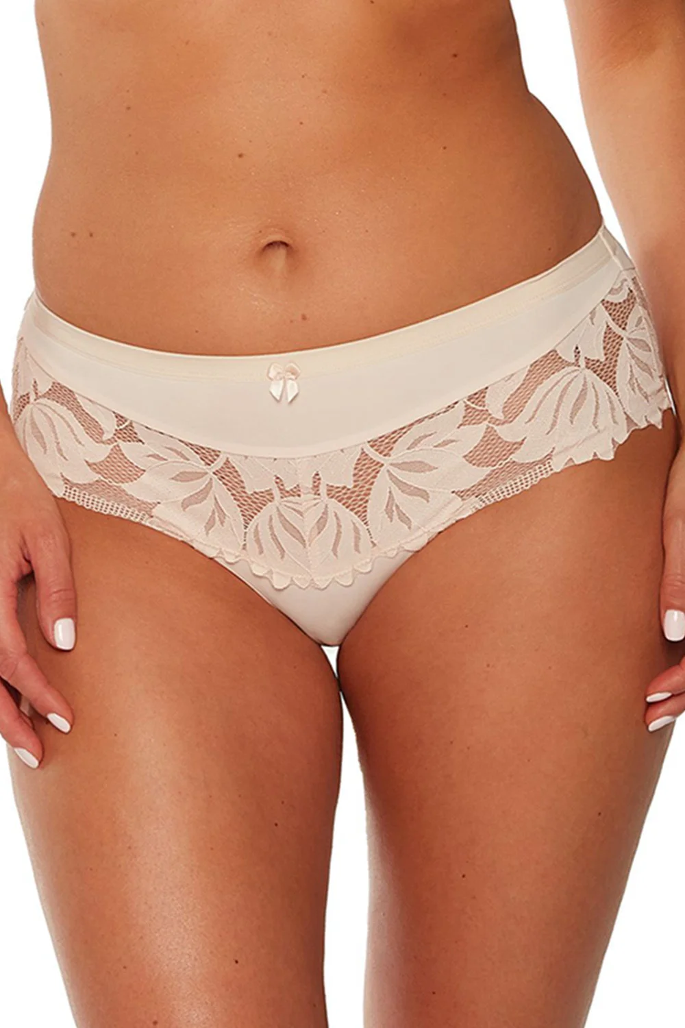 Extrémně ženské kalhotky Keto klasického střihu, vyrobené z krásné krajky a hladkého úpletu. Krásná mašlička na přední straně.