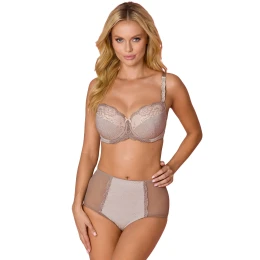 Elegantní kalhotky v barvě mocca s vyšším plným střihem jsou vyrobené ze vzorovaného úpletu, jemné krajky a síťoviny.