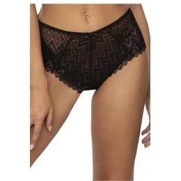 Figi dámské vysoké černé Elif, vyrobené z jemné krajky se zvlněným vzorem, která je elegantní a pohodlná zároveň. Přední strana je zdobena decentní mašlí, a krajkové lemují kolem nohaviček přidávají lehkost a jemnost. Zadní část je z dvojitého tylu. Elastický pás zajistí pohodlí nošení a skvělé přizpůsobení postavě. Ideální na každý den i na speciální příležitosti, skvěle ladí s push-up podprsenkou, vytvářejíce smyslný komplet spodního prádla.