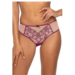 Dámské kalhotky s klasickým, plným střihem. Přední část je z béžové síťoviny zdobená kontrastním vyšíváním a ozdobnou mašlí. Zadní část je vyrobena z dvojitě složené síťoviny.