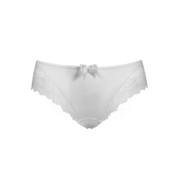 Klasické dámské kalhotky s lehce střiženým střihem. Přední část hladká, ozdobená jemnou mašlí. Nohavičky a zadek vyrobené z krajkové látky. Bavlněný klín.