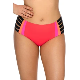 Plavkové kalhotky s vysokým střihem a 5 černými pruhy na bocích. Intenzivní korálová barva je kombinována s cukrově růžovou a šťavnatě oranžovou , zatímco kontrastní černé vsadky dodávají designu charakter.