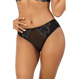 Okouzlující kalhotky v černé barvě jsou dokonalým doplňkem modelu V-10381. Pohodlné a lehké, obepínají vaše tělo jemným tylem, v bočních zónách vsadkami z nejkvalitnější krajky, která se třpytí ve zlatých a modrých odstínech . Pohodlný a široký klín zajistí komfort při nošení. Materiálové složení: polyamid 89 %, elastan 6 %, bavlna 4 %, polyester 1 %