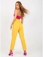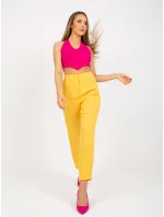 Tmavě žluté látkové kalhoty s rovnými nohavicemi .