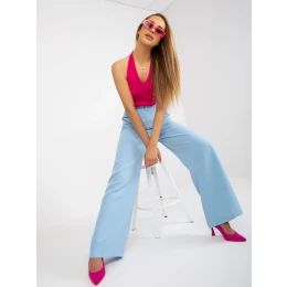 Světle modré látkové kalhoty s širokými nohavicemi .
