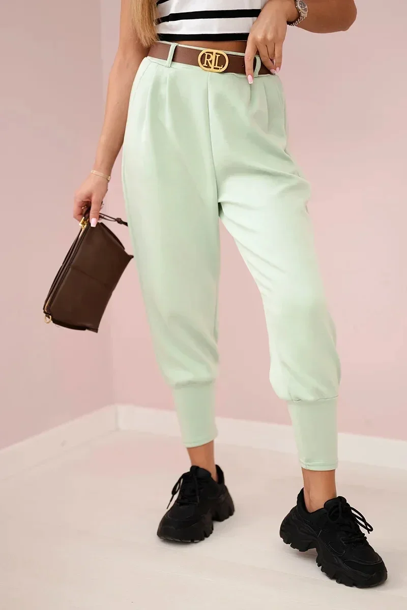 Kalhoty s páskem a kapsami z máslové látky tmavá máta