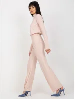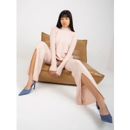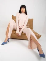 Světle růžové úpletové kalhoty se širokými nohavicemi a rozparkem .