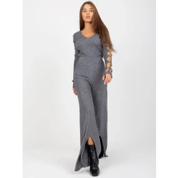 Tmavě šedé pletené kalhoty s vysokým rozparkem v pase.