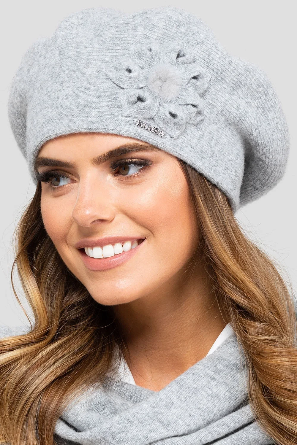 Pokrývky hlavy od společnosti Kamea. Model Seville. Výrobek je vyroben z 80 % z vlny a 20 % z polyamidu. Výrobek pro ženy.