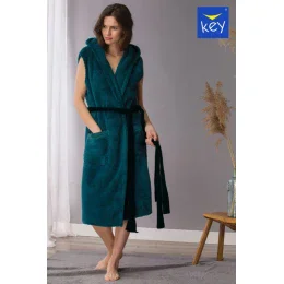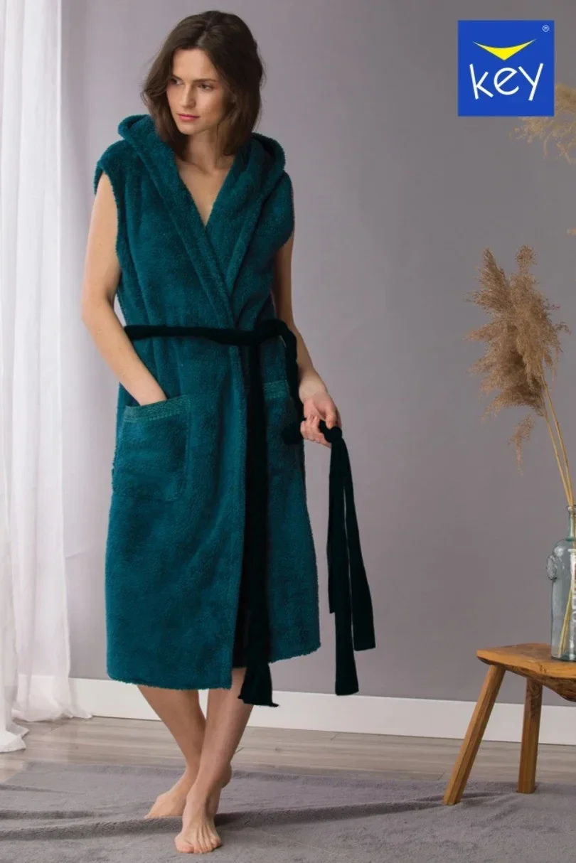 Dámská vesta s kapucí. Vyrobeno z měkkého a sametového plyšového úpletu. Kapsy zdobené jemnou krajkou. Zavazuje se v pase šňůrkou.