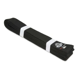 Černý pásek pro kimona používaná v bojových sportech vyrobený z materiálu, který je směsí polyesteru a bavlny pro odolnost proti oděru a roztržení.