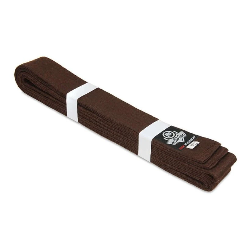 Hnědý opasek pro kimona používaná v bojových sportech vyrobený z materiálu, který je směsí polyesteru a bavlny pro odolnost proti oděru a roztržení.