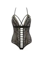 Toto romantické černo-zlaté body je kombinací klasické černé barvy a jemných zlatých prvků, stejně jako zajímavých ozdob. Díky krajkovému projmutí se diváci mohou kochat pohledem na vaši hladkou pokožku a ženský vzor a saténové mašličky podtrhují svůdný charakter návrhu. Dvanáct pruhů spojuje střední část body a každý z nich má zlaté ozdoby, které vás rozzáří. Stejné ozdoby na trojicích pruhů najdete také na spodní části zad. Model má překřížená ramínka zapínaná na háček na úrovni prsou a v rozkroku. Nemá žádné dráty. Materiálové složení: Polyamid 85 %, Elastan 12 %, Bavlna 1 %