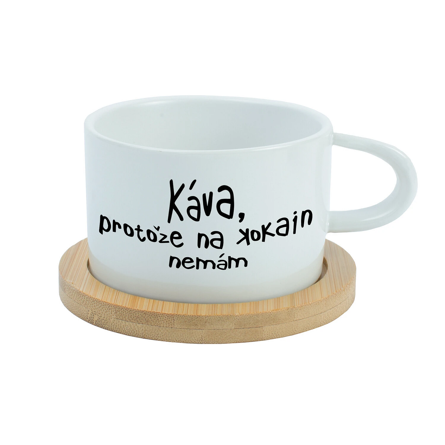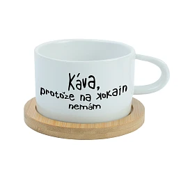 Keramický hrneček s bambusovým podtáckem – KÁVA, PROTOŽE NA KOKAIN NEMÁM