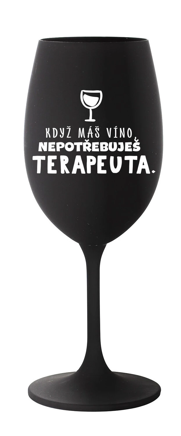KDYŽ MÁŠ VÍNO, NEPOTŘEBUJEŠ TERAPEUTA - černá sklenice na víno 350 ml
