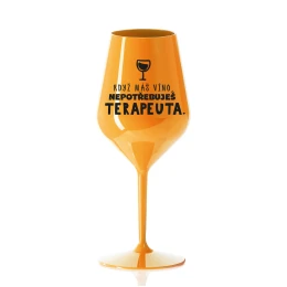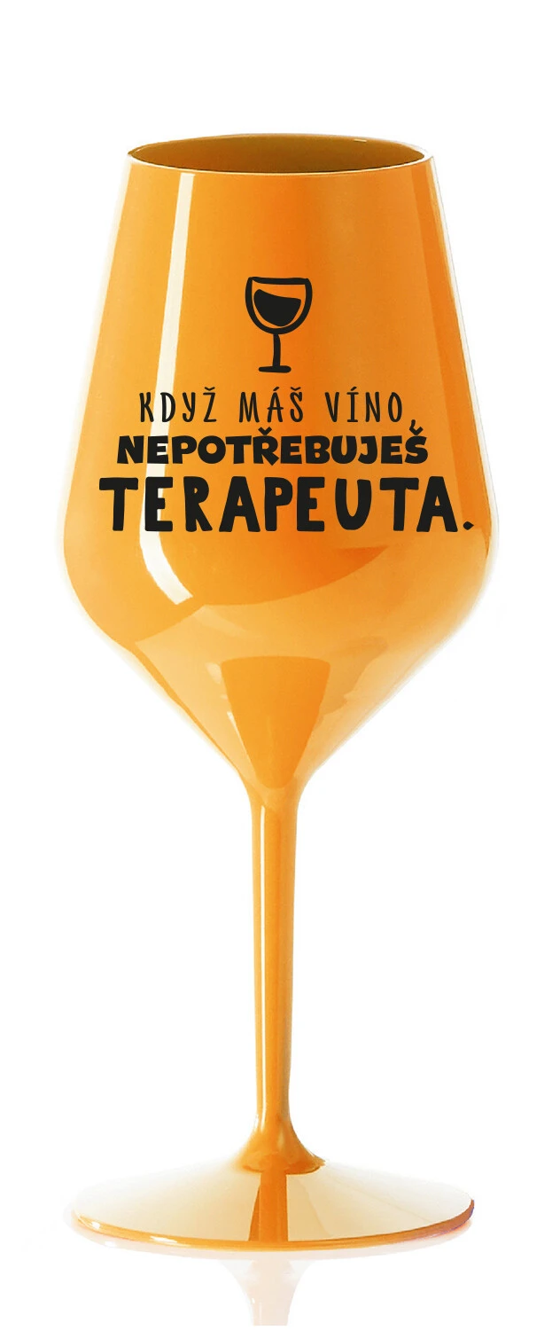 KDYŽ MÁŠ VÍNO, NEPOTŘEBUJEŠ TERAPEUTA - oranžová nerozbitná sklenice na víno 470 ml