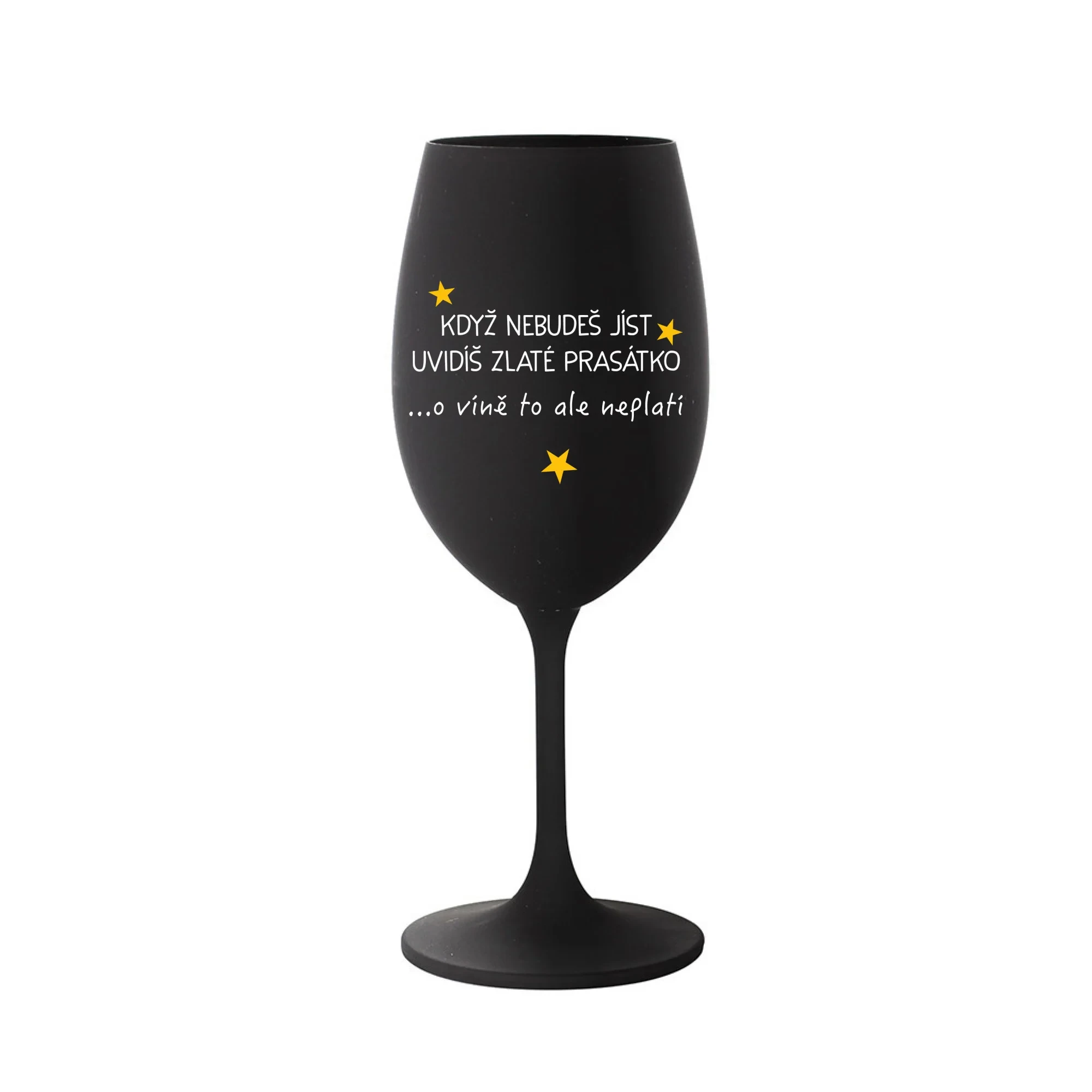 KDYŽ NEBUDEŠ JÍST, UVIDÍŠ ZLATÉ PRASÁTKO - černá sklenice na víno 350 ml