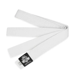 Bílý opasek pro kimona používaná v bojových sportech vyrobený z materiálu, který je směsí polyesteru a bavlny pro odolnost proti oděru a roztržení.