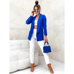 Sako má podšívku, klopy a dlouhé rukávy. Model má délku do poloviny stehen.