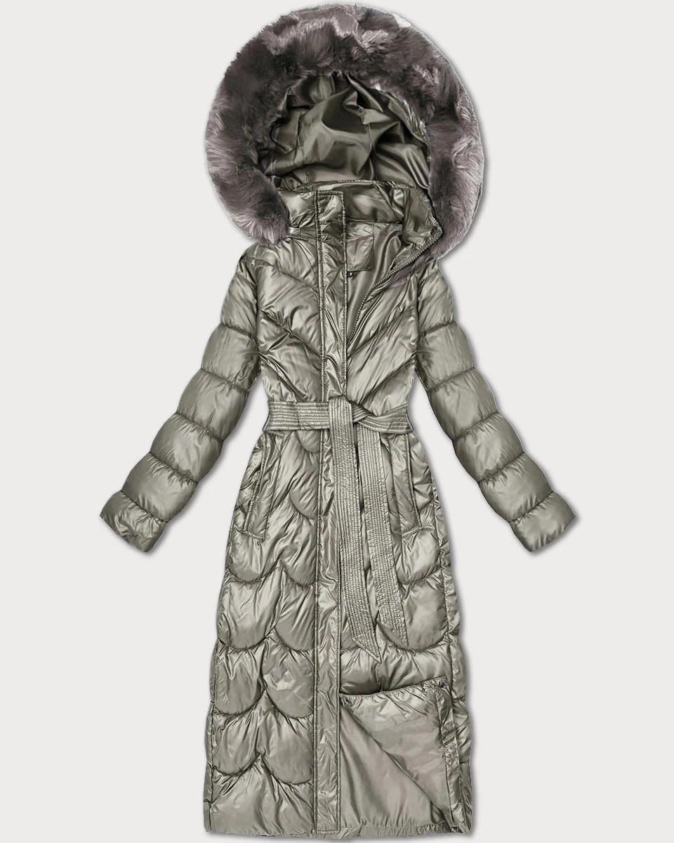 Kabát je lehce vypasovaný, je lehce zateplený syntetickou péřovou výplní, má pásek pro zavazování, dvě kapsy bez zapínání a zapíná se dvousměrným zipem a panelem s patentkami. Model má kapuci olemovanou kožešinou. Kapuci i kožešinu je možné odepnout. Kabát má délku ke kolenům.