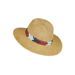 Tento nádherný letní klobouk má široký lem a barevný pletený pás kolem klobouku dodává šmrnc.