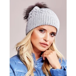 Čepice s kostkovaným vzorem a chlupatou bambulí šedá