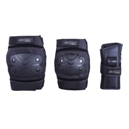 - Chrániče kolen a loktů drží na svém místě pomocí elastických pásků na suchý zip a chrániče zápěstí pomocí dvou neroztažitelných pásků na suchý zip. Celé balení je dodáváno v praktické síťované tašce.