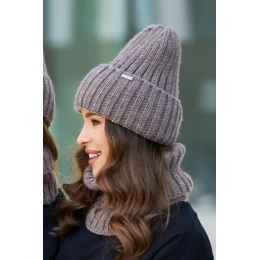 Zimní dámská/mladá zimní souprava v širokém střihu, která se skládá z módní čepice se širokým okrajem a komínkem. Měkké, na dotek příjemné vlasy, dobře chrání před chladem