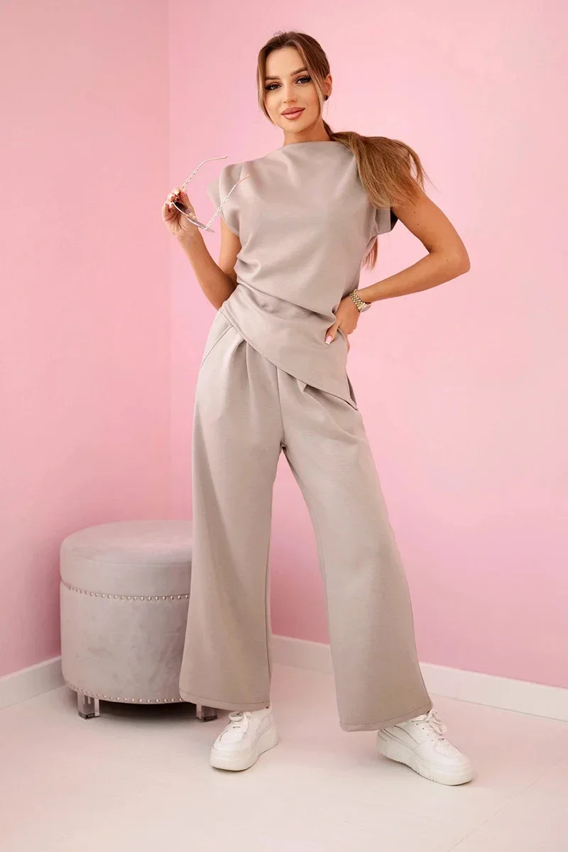 Komplet asymetrická halenka + kalhoty tmavě béžová