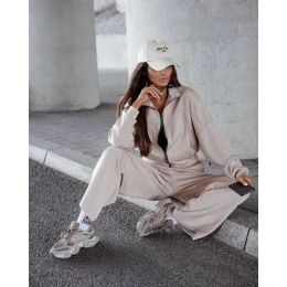 Béžový dámský komplet - mikina se stojáčkem a široké kalhoty (821109)
