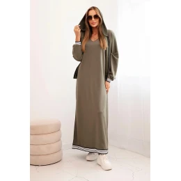 Pohodlný a módní dámský komplet z viskózy, který se skládá z dlouhé šaty a krátké mikiny s kapucí a zipem. Šaty mají jednoduchý střih s jemně rozšířeným spodním lemem, díky čemuž se skvěle přizpůsobují postavě. Mikina s praktickými kapsami a kontrastními náplety dodává sportovní charakter a činí, že souprava vypadá moderně a uvolněně.