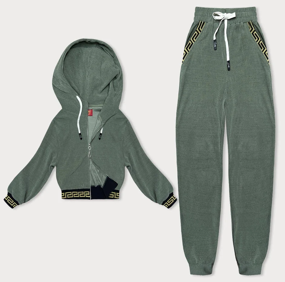 Teplákový žebrovaný komplet v olivové barvě s ozdobnými stahovacími lemy (AMG-345A)